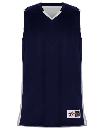 Double ply reversible basketball jersey with modified V-neck100% Colorfast Polyester Microfiber with body color side overlay, body color front and back 100% Colorfast Polyester Diamond knit front and back body, Reverse side is contrast color Body color modified V-neck inset collar with contrast color front of V-neckContrast color 100% Colorfast Polyester Diamond Knit side insertContrast color Diamond Knit overlay at shoulder openingCover seemed throughout for durability and appearance