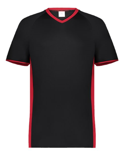 96/4 polyester/spandex with color secure technology that helps prevent dye migrationLightweight knitMoisture wicking4-way stretch properties allow for increased mobilityV-neck collarRaglan sleevesUPF 50+ protectionTear away label